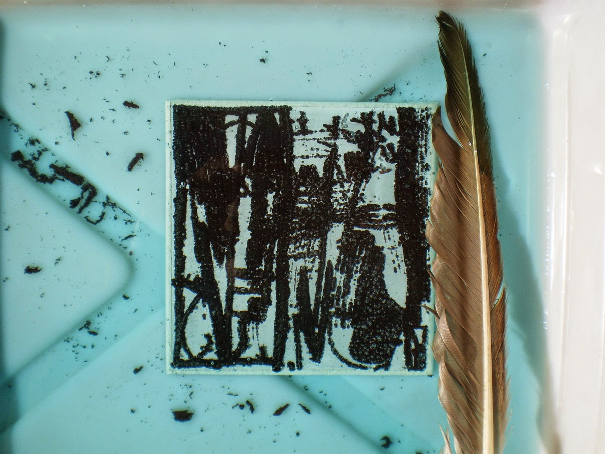 En estas imagenes vemos la manera en que el mordiente de sulfato de cobre, sal de mesa y agua (Mordiente de Burdeos) actua en una plancha de aluminio protegida con base acrilica. El residuo que remueve la pluma es oxido de cobre, que dejandolo secar al sol se puede reciclar como pigmento de color verde plateado.